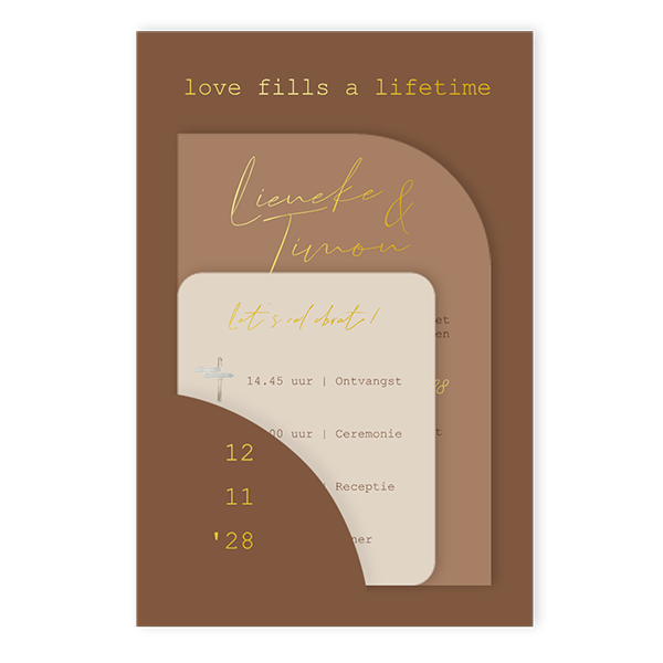 Een unieke trouwuitnodiging met insteekkaartjes in warm bruine tinten. Zijn dit niet helemaal de kleuren voor jullie bruiloft? Dan kun je in de kaartopmaker de kleur van de achtergrond aanpassen zodat deze trouwkaart helemaal naar jullie wens is.