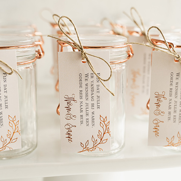 Maak een labeltje voor een bedankje van 7 bij 3,5 cm en een gaatje. Dit labeltje kun je dankzij het gaatje zelf aan je bedankje vastmaken.* Ontwerp in stijl van de kaart
