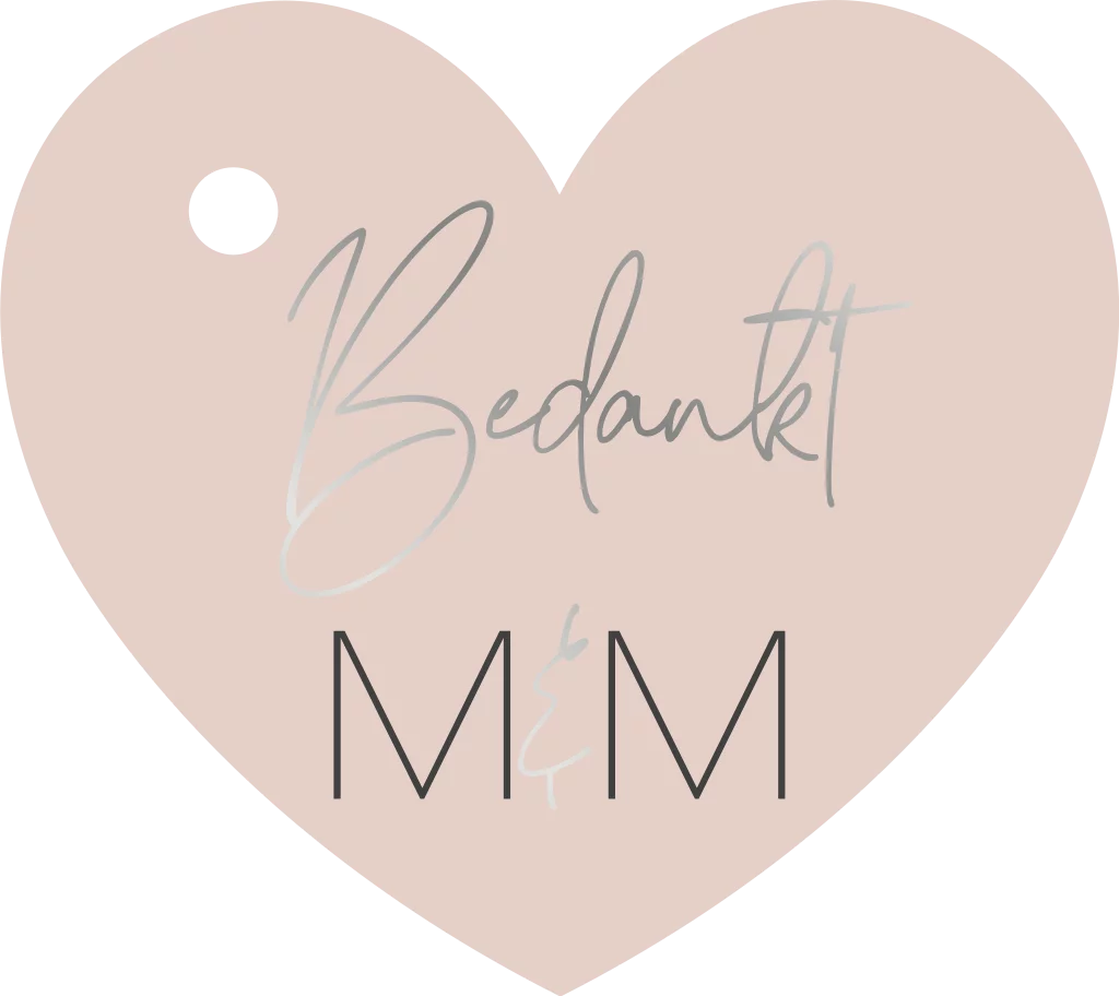 Maak een labeltje in de vorm van een hartje met zilverfolie. Dit labeltje kun je dankzij het gaatje zelf aan je bedankje vastmaken. Maak in de kaartopmaker een leuk ontwerp naar eigen wens. Let op dat dit een klein kaartje is waar niet veel tekst op kan.* Ontwerp in stijl van de kaart