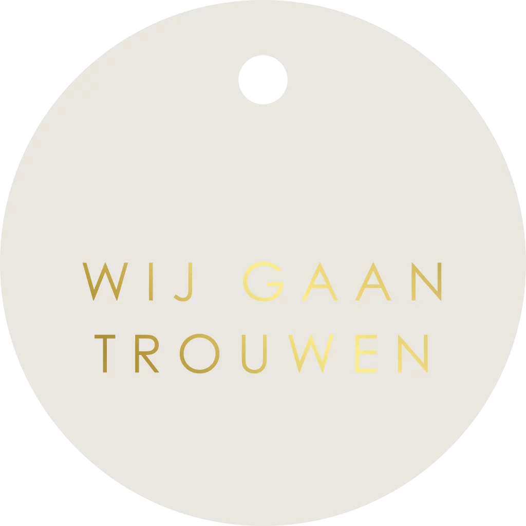 Maak een rond labeltje met goudfolie en bevestig deze op jullie trouwkaart of een ander product.