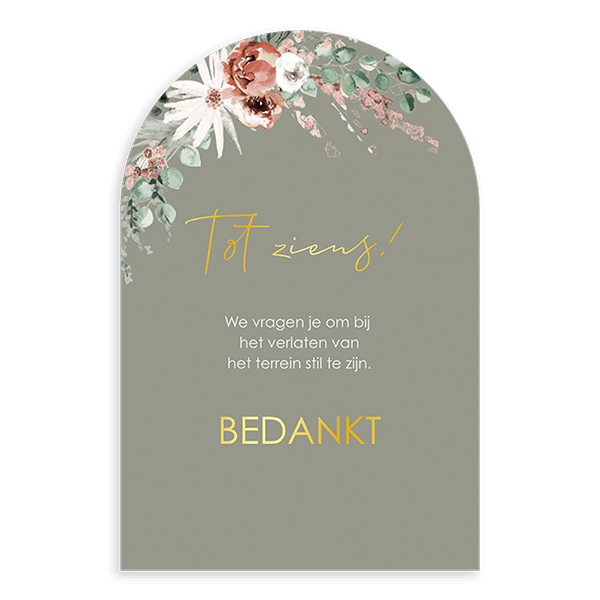 Ontwerp een romantisch bordje met bloemen en goudfolie. Plaats dit bordje bij het afscheid aan het einde van de bruiloft.| Totaalprijs: 0 |