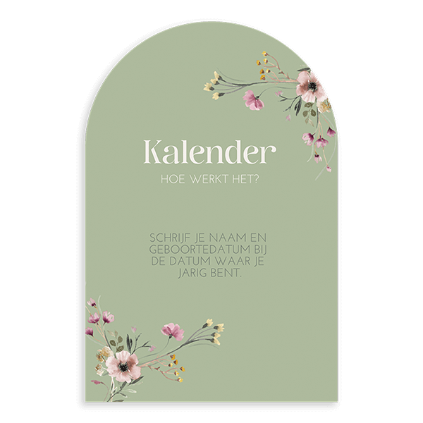 Maak een bordje in boogvorm met bloemetjes bij de kalender. Op dit bordje leg je uit hoe de kalender als gastenboek werkt.| Totaalprijs: 0 |
