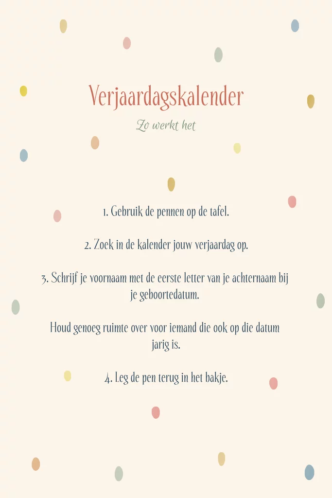 Ontwerp een kleurrijk bordje met stipjes voor bij de kalender als gastenboek. Op dit bordje leg je wat er van de gasten verwacht wordt.