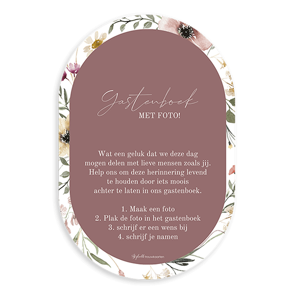 Ontwerp een handig bordje bij het gastenboek. Dit is een ovaal romantisch bordje met bloemen. Zet op dit bordje de informatie of een stappenplan over het gastenboek, zo weten gasten wat er van hun verwacht wordt. Je kunt onze houten kaarthouder er bij bestellen zodat het bordje mooi blijft staan bij het gastenboek.