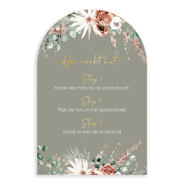 Zet een bordje met een stappenplan bij het gastenboek. Zo weten de gasten wat er van hun verwacht wordt. Dit is een romantisch bordje in boogvorm met bloemen en tekst in goudfolie.| Totaalprijs: 0 |