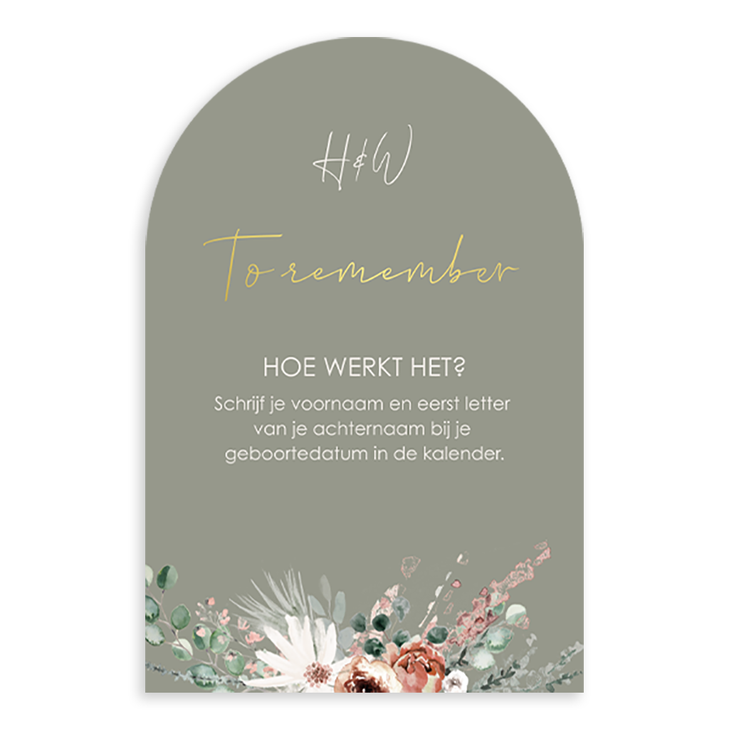 Een romantisch bordje met bloemen voor bij de gastenboek kalender. Vermeld op dit bordje wat de bedoeling is van de kalender als gastenboek.| Totaalprijs: 0 |