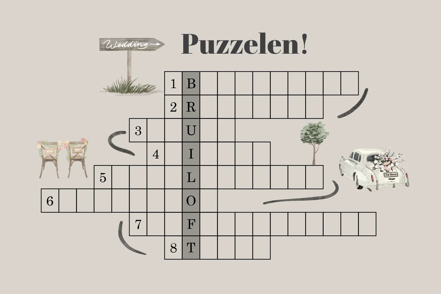 Zijn er veel kinderen op jullie bruiloft? Geef ze dan deze puzzel om zich te vermaken. Laat de kinderen de puzzel maken voor een leuk prijsje. Op de achterkant van deze kaart staan de vragen.