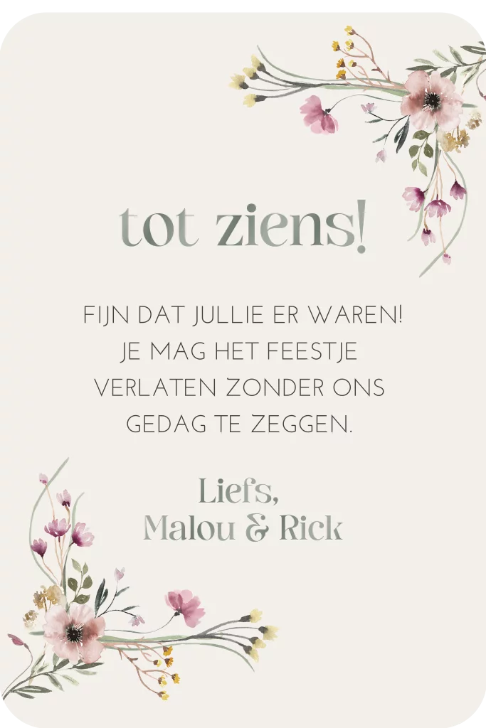 Ontwerp een bordje voor aan het einde van de bruiloft. Zo weten de gasten wat er van hun verwacht wordt. Dit bordje past bij een trouwkaart in dezelfde stijl.
