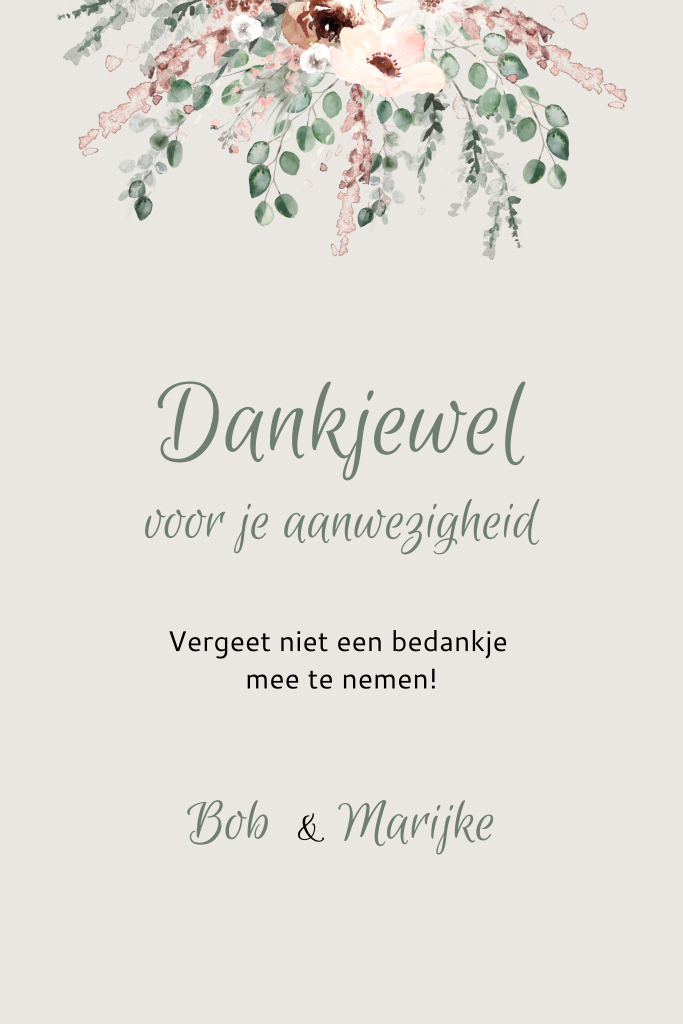 Een bordje voor bij de bedankjes aan het einde van je bruiloft. Dit is een bordje met bloemen en blaadjes en past bij een trouwkaart in dezelfde stijl.