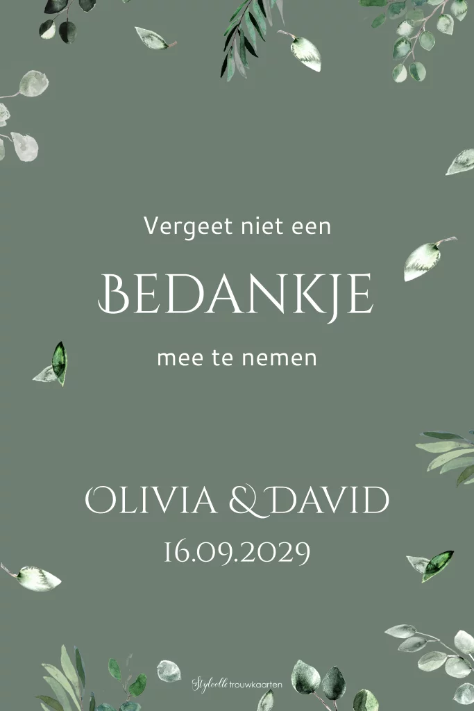 Dit bordje bij bedankjes maakt deel uit van de trouwkaarten set Olivia.