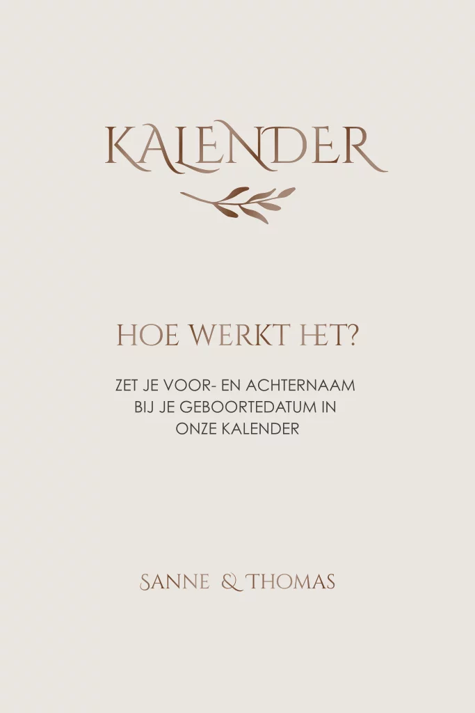 Plaats bij de kalender dit beige bordje met blaadje en uitleg. Zo hebben jullie een waardevolle herinnering aan de bruiloft en je vergeet geen verjaardag!| Totaalprijs: 0 |
