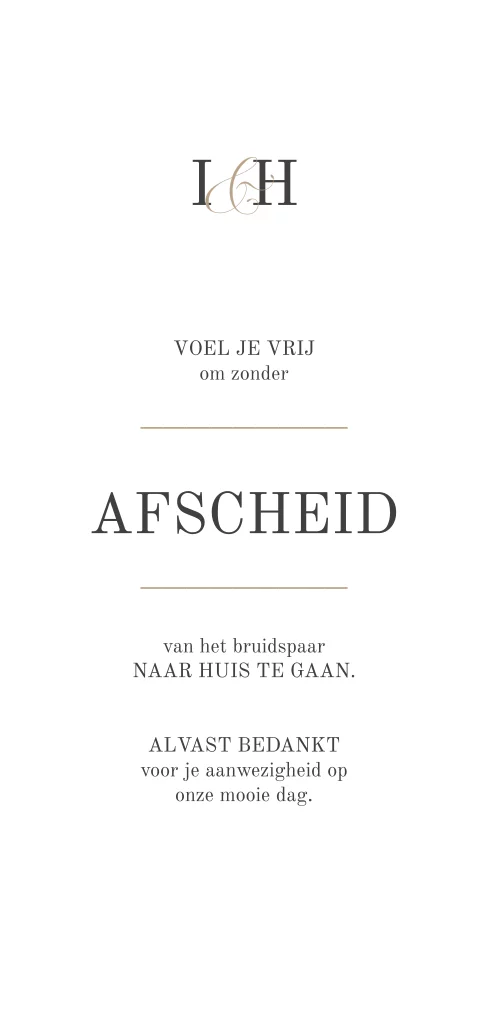 Ontwerp een klassiek afscheid bordje voor aan het einde van de bruiloft. Zo weten de gasten wat er van hun verwacht wordt. Dit bordje past bij een trouwkaart in dezelfde stijl.