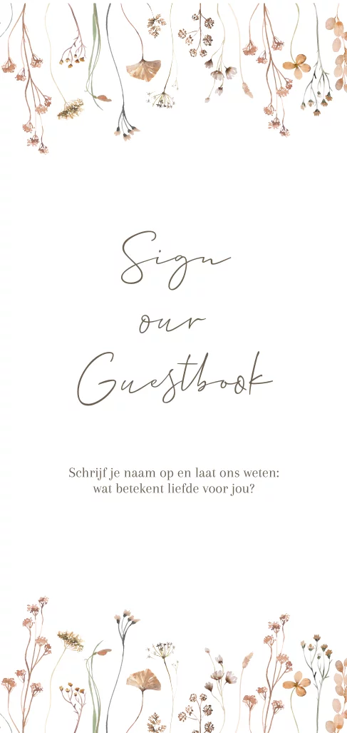 Dit informatiebordje met bloemen bij gastenboek maakt deel uit van een trouwkaartenset.