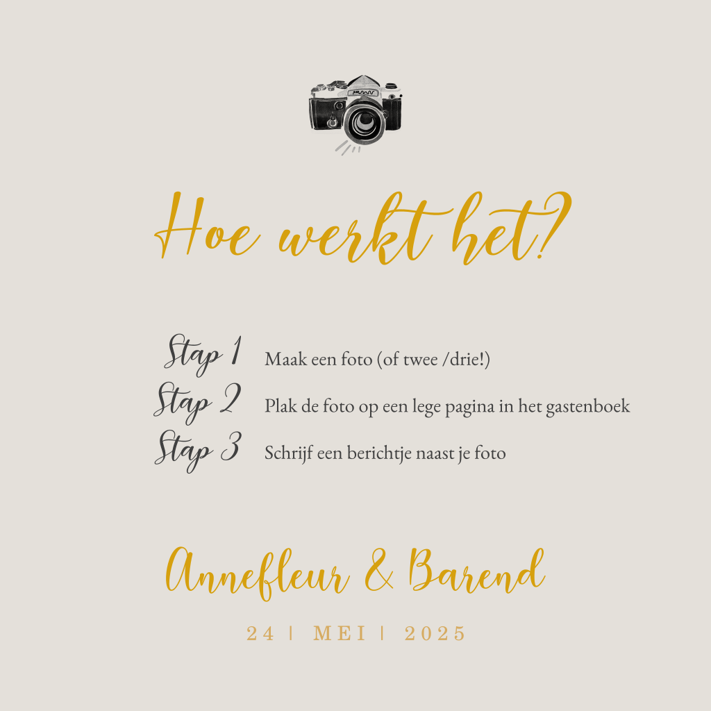 Dit bordje bij het foto gastenboek is handig. Je kunt uitleggen wat de bedoeling is. Het ontwerp past bij de trouwhuisstijl Classic Dream.