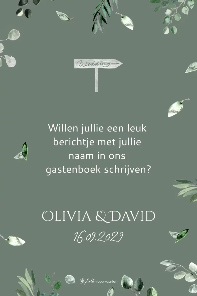 Deze botanische bordje bij gastenboek maakt deel uit van de trouwkaarten set Olivia.