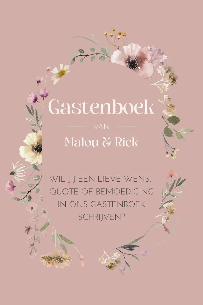 Ontwerp een roze bordje met en aanwijzingen bij het gastenboek. Dit is een bordje met een bloemenkrans en past bij een trouwkaart in dezelfde stijl.| Totaalprijs: 0 |