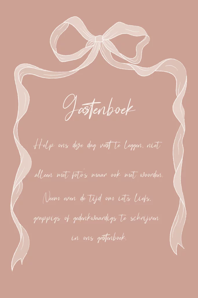 Plaats een handig bordje met uitleg bij het gastenboek. Dit is een romantisch bordje met strik, passend bij het gastenboek in dezelfde stijl. Je kunt onze houten kaarthouder er bij bestellen zodat het bordje mooi blijft staan bij het gastenboek.