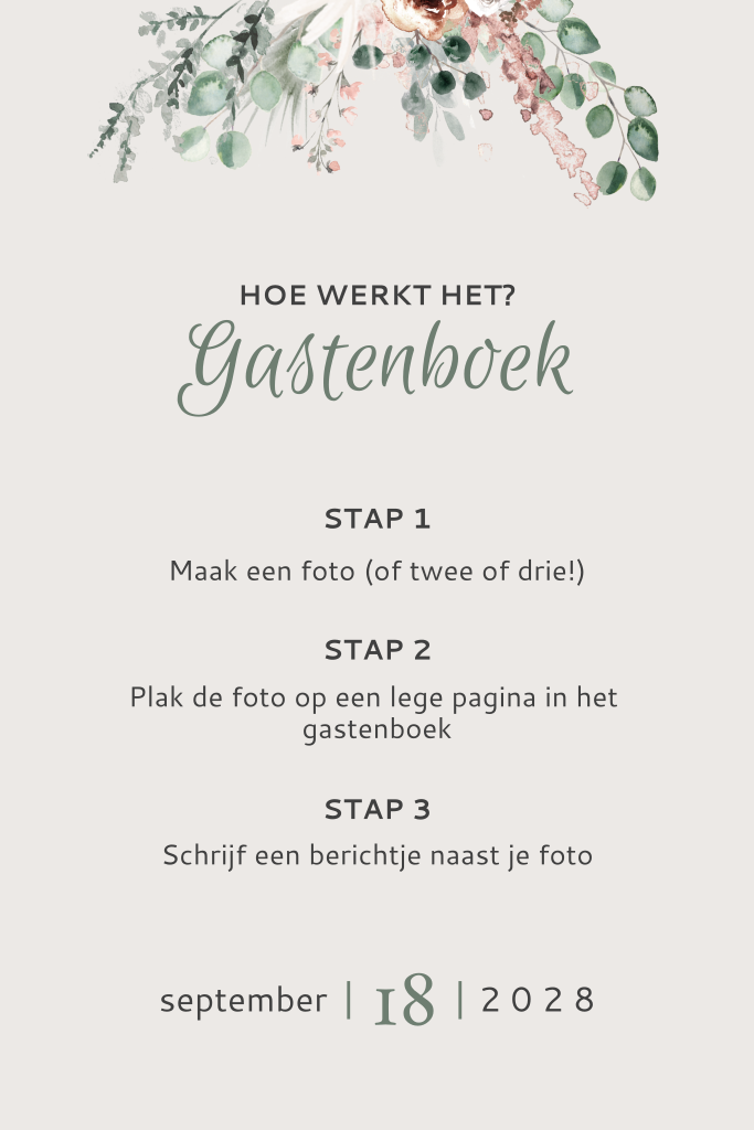Dit bordje in taupe met bloemen hoort bij een gastenboek in dezelfde stijl. Leg uit wat de bedoeling is door deze grote kaart bij het gastenboek te plaatsen. Door het stappenplan weten gasten wat ze moeten doen en hebben jullie een prachtig gastenboek ter herinnering met foto's en liefdevolle woorden.