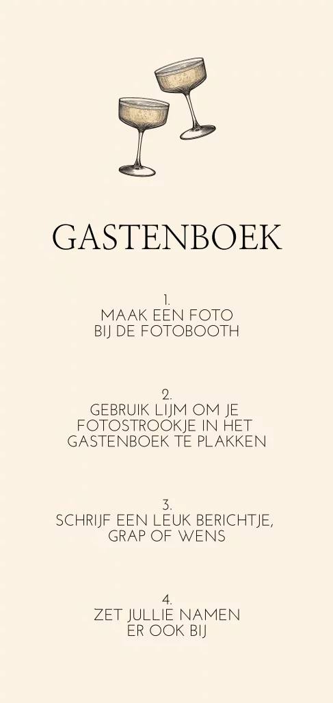 Plaats een handig bordje bij het gastenboek. Dit is een langwerpig, beige bordje met champagneglazen. Zet op dit bordje het stappenplan voor het gastenboek.