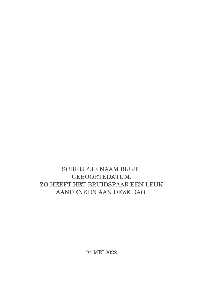 Maak een stijlvol bordje bij de kalender gastenboek. De tekst en het logo op dit bordje worden in goudfolie gedrukt. Dit past bij de kalender in dezelfde stijl. Op dit bordje kan je vermelden hoe de kalender werkt.| Totaalprijs: 0 |