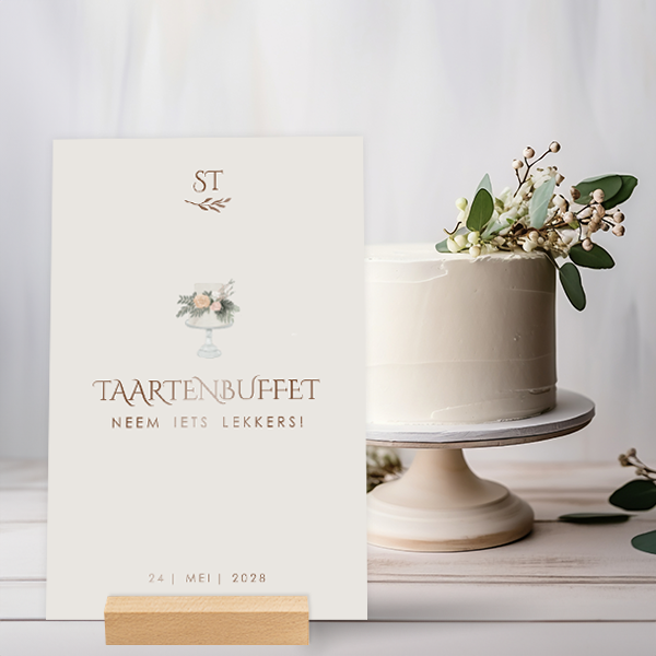 Decoreer de tafel met taarten - of ander lekkers - met dit bordje. Dit bordje past bij een trouwuitnodiging in dezelfde stijl.| Totaalprijs: 0 |