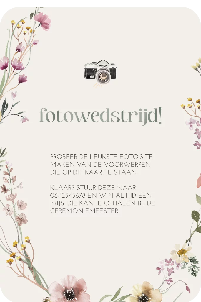 Zijn er veel kinderen op jullie bruiloft? Laat ze meedoen aan dit leuke spel: een fotowedstrijd. Ze kunnen tijdens de receptie of het feest creatief bezig zijn met het maken van foto's. Dit is een kaartje met bloemetjes en hoogglans, passend bij een trouwkaart in dezelfde stijl.