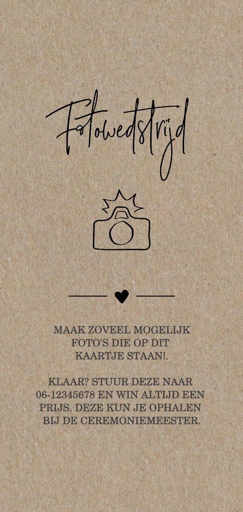 Laat de kinderen meedoen aan dit leuke spel: een fotowedstrijd. Dit is een kaartje in kraftlook. Ze kunnen tijdens de receptie of het feest creatief bezig zijn met het maken van foto's. Deze kunnen ze maken met een wegwerpcamera of een mobiel (van papa of mama).