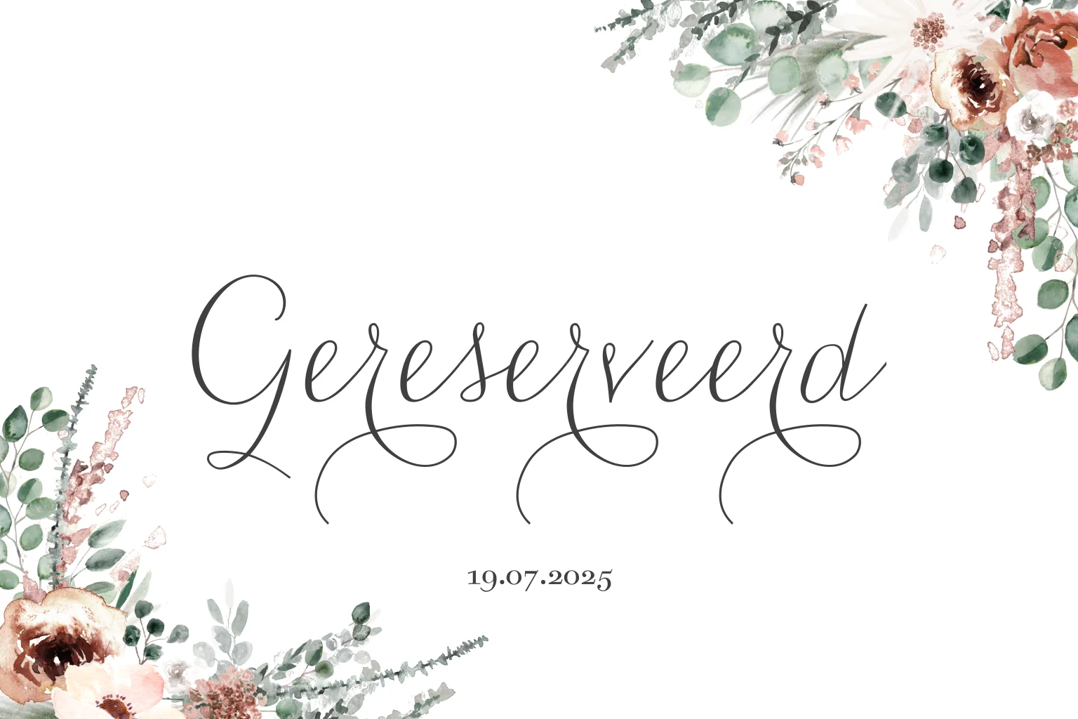 Wil je stoelen reserveren voor gasten? Ontwerp een gereserveerd kaartje in de stijl van je trouwkaart. Dit is een bohemian gereserveerd kaartje met illustratie van bloemen. Wij adviseren het formaat 5 bij 8 cm - dit is ongeveer een visitekaartje.