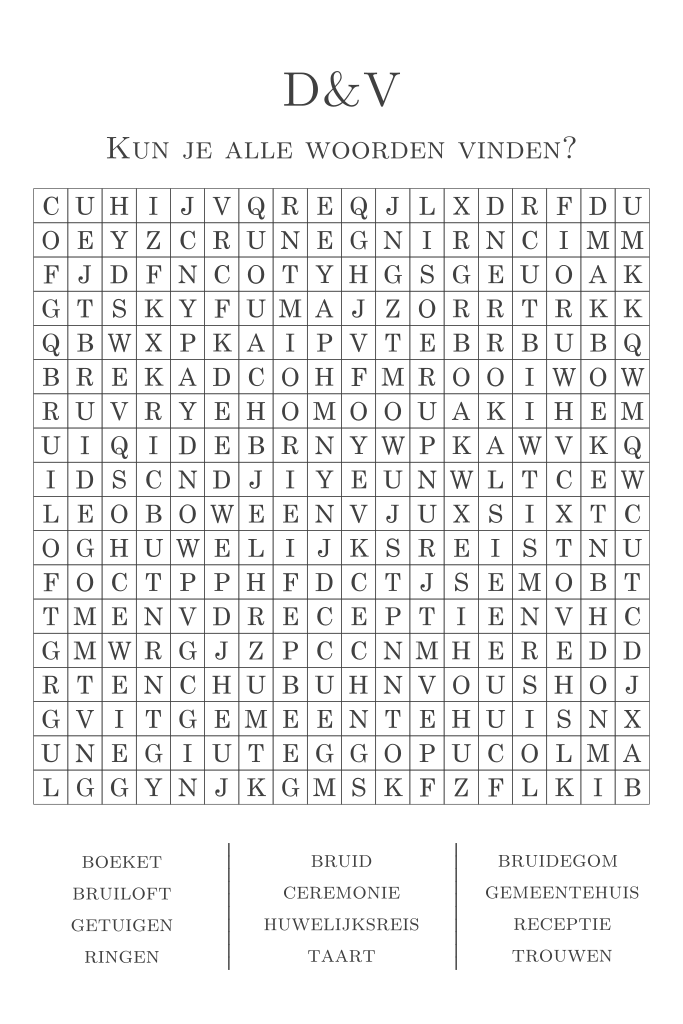 Maak een woordzoeker voor op de bruiloft. Met deze woordzoeker houdt je kinderen bezig. Leuk om toe te voegen in een goodybag.
