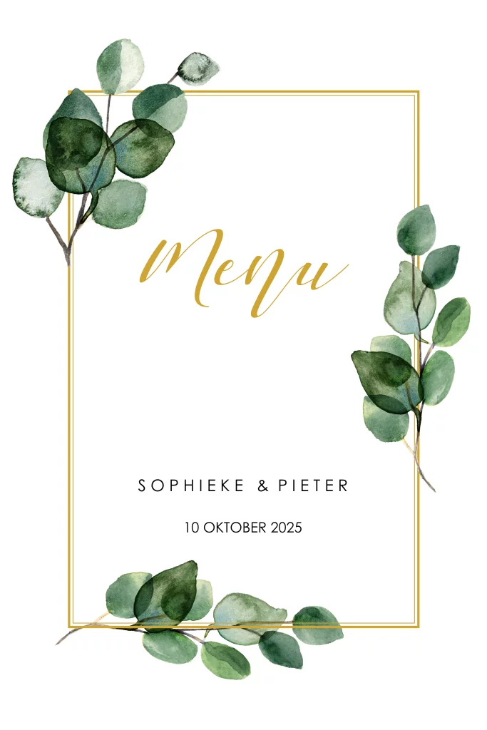 Deze menukaart met blaadjes maakt deel uit van een trouwkaartenset.