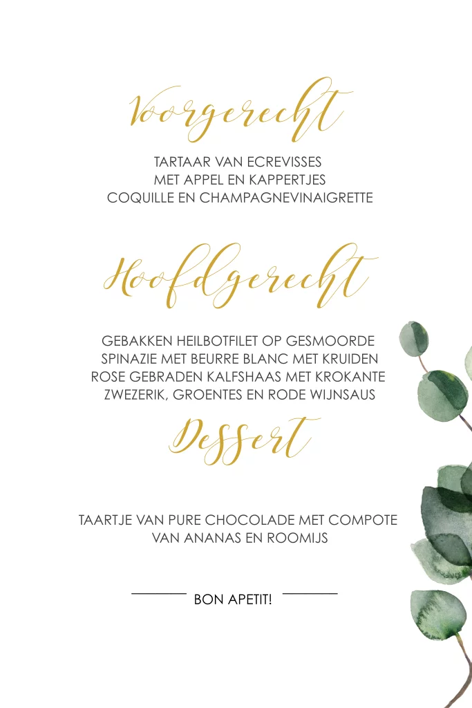 Maak een mooie menukaart voor jullie 1e diner als man en vrouw met dit voorbeeld. Van deze menukaart is ook een trouwkaart. In de kaartopmaker voer je jullie eigen menu is. Klik nu op BEWERK DEZE KAART en maak in de kaartopmaker een mooi ontwerp. Bestel daarna een proefdruk voor 1 euro. Bij je 1e proefdruk ontvang je een proefsetje met samples van alle papiersoorten en kleuren enveloppen.