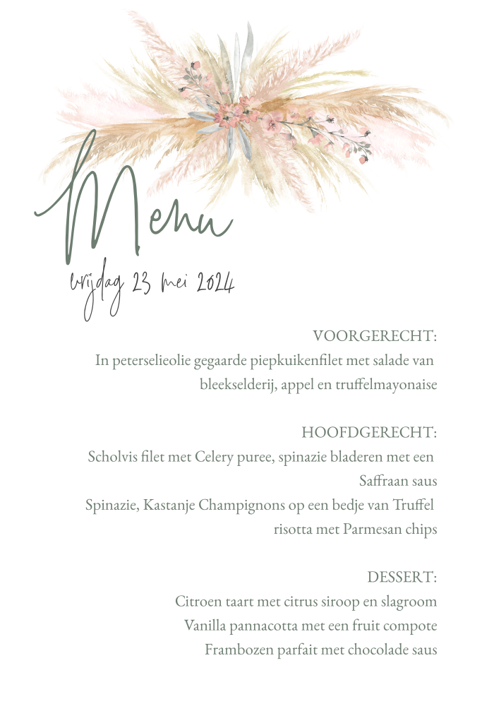 De nieuwste trend is de Flower Cloud of wel de bloemenwolk van droogbloemen. We hebben een mooie trouwkaart gemaakt en daar past deze Menukaart goed bij. Past deze stijl bij jullie bruiloft? Maak dan een mooi en uniek ontwerp.