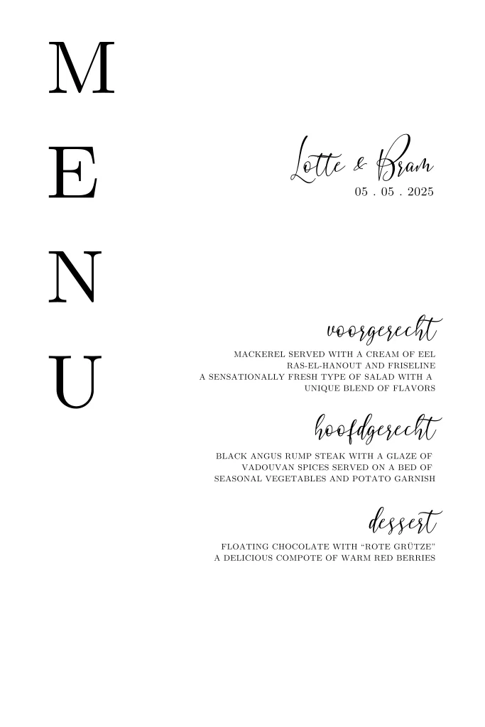 Strak en minimalistisch is deze trouwkaart. Past deze stijl bij de setting van jullie diner? Maak dan een eigen ontwerp in de kaartopmaker.| Totaalprijs: 0 |