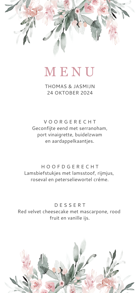 Deze menukaart passend maakt deel uit van een trouwkaartenset.