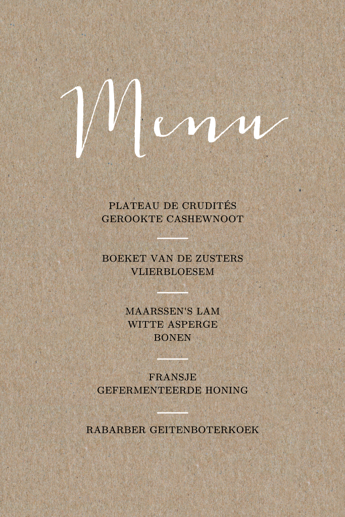 Maak voor het diner op jullie bruiloft een stijlvolle menukaart van kraft papier.