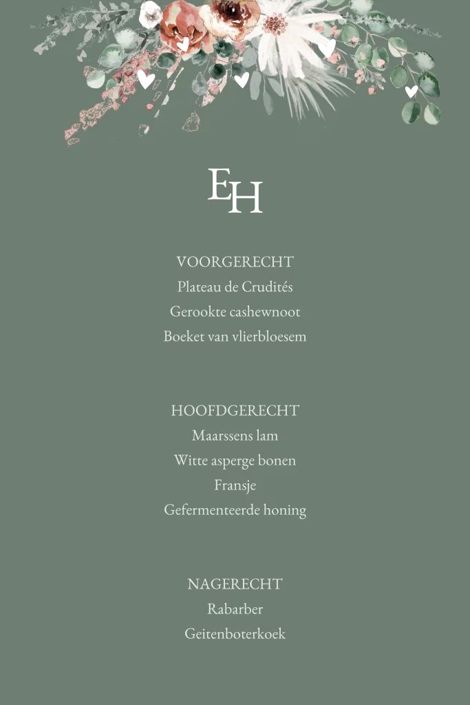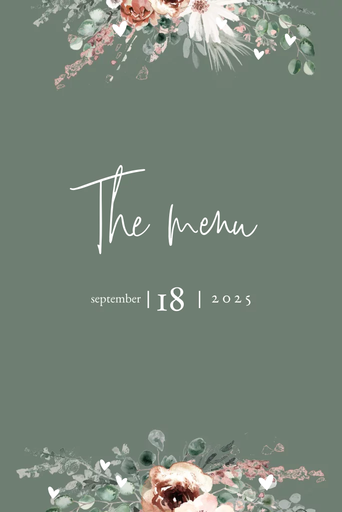 Ontwerp een menukaart in de stijl van je trouwkaart. Dit is een groene menukaart met veel bloemen en goudfolie. De menukaart is dubbel, waardoor er genoeg ruimte is voor een persoonlijke boodschap, quote of foto's naast het menu.