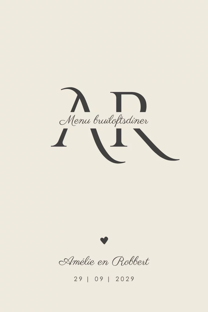 Ontwerp een klassieke menukaart voor jullie eerste diner als man en vrouw. Dit is een beige menukaart met een logo van jullie initialen. De menukaart is dubbel, dus naast het menu is er genoeg ruimte voor een persoonlijke boodschap of mooie quote.