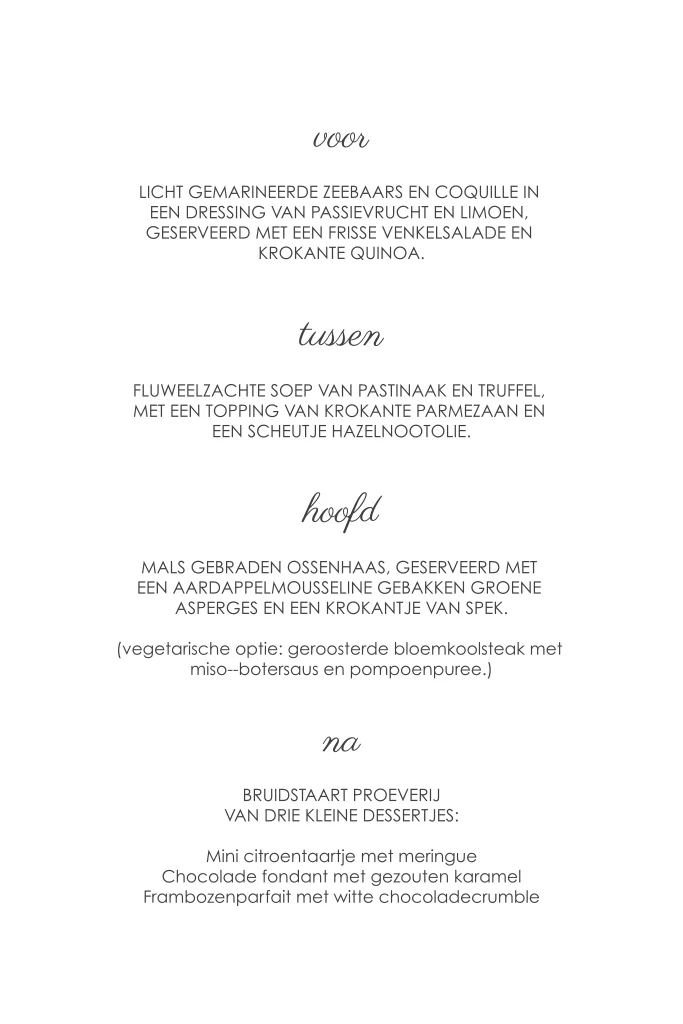 Deze klassieke menukaart met logo maakt deel uit van een trouwkaartenset.
