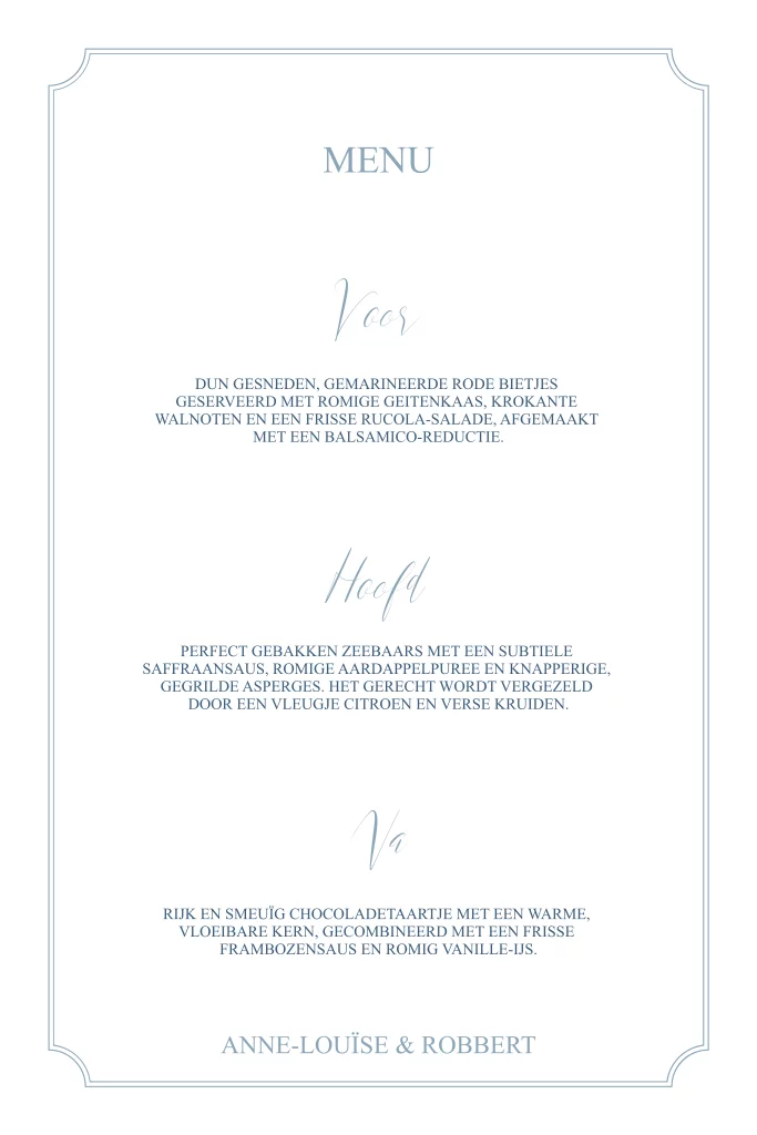 Deze klassieke menukaart in blauw met kader maakt deel uit van een trouwkaartenset.