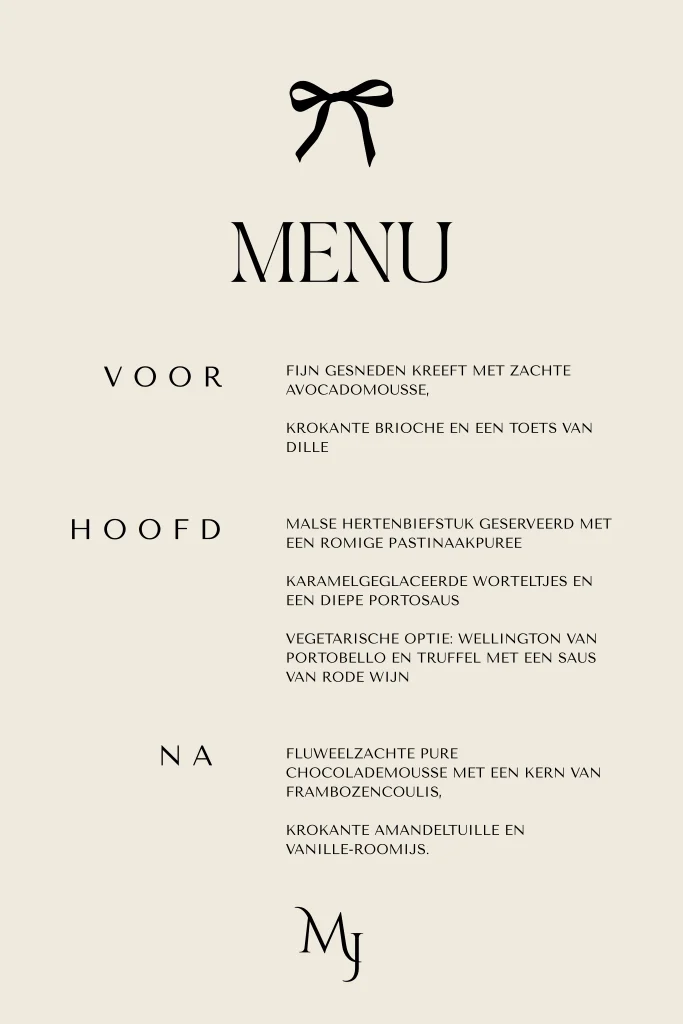 Bestel een beige menukaart voor jullie bruiloftsdiner. Dit is een klassieke menukaart met strikje en logo van jullie initialen. Vul jullie menu hier in en deel het uit aan jullie gasten.