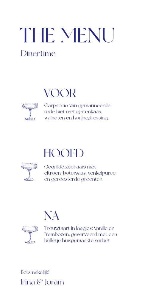 Bestel een menukaart voor jullie eerste diner als man en vrouw. Dit is een trend menukaart bruiloft met champagneglazen. De tekst en illustratie worden in kobaltblauw gedrukt, passend bij de rest van de trouwhuisstijl. Liever een andere kleur? In de editor pas je eenvoudig alle kleuren en teksten aan.