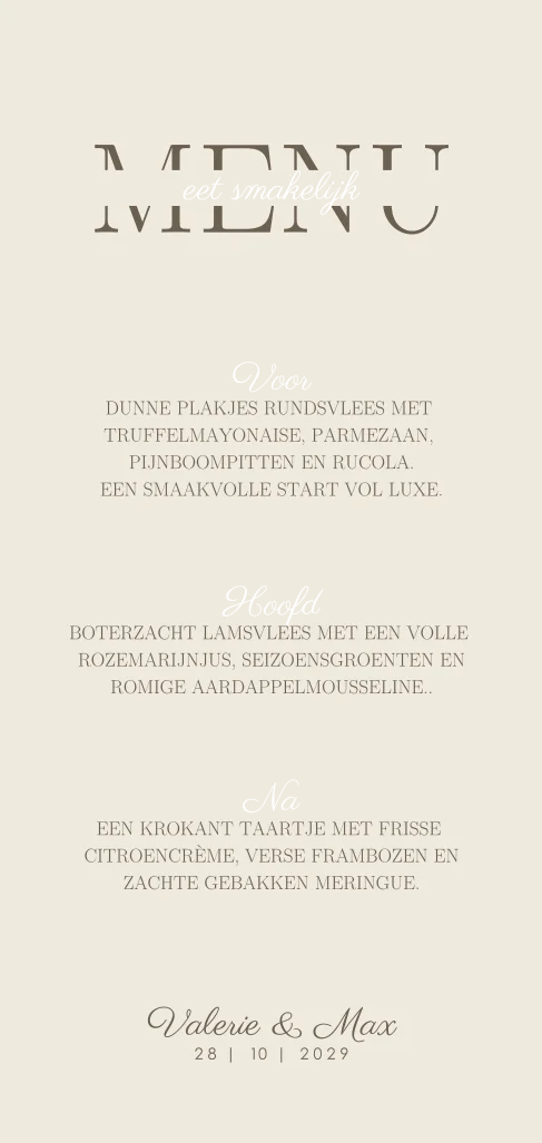 Bestel een klassieke menukaart in beige tint. Voeg zelf jullie bruiloftdiner toe in de editor. Sommige teksten worden in goudfolie gedrukt, wat iets op de kaart ligt.