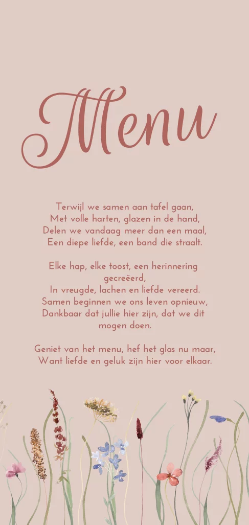 Ontwerp een roze menukaart voor jullie bruiloftsdiner. Op deze menukaart voor bruiloft staat op de voorkant een gedichtje en bloemetjes. Op de achterkant voeg je jullie diner toe.