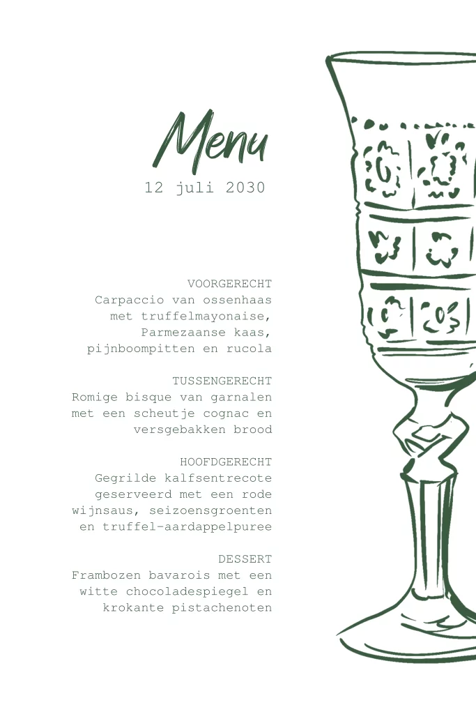 Deze menukaart in groen met wijnglas maakt deel uit van een trouwkaartenset.