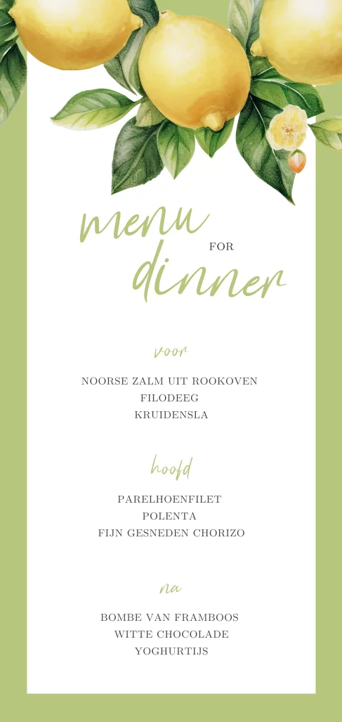 Ontwerp een menukaart met citroentjes. In de editor pas je eenvoudig het menu aan. Ontwerp ook naamkaartjes en een tafelnummerkaart in dezelfde stijl.
