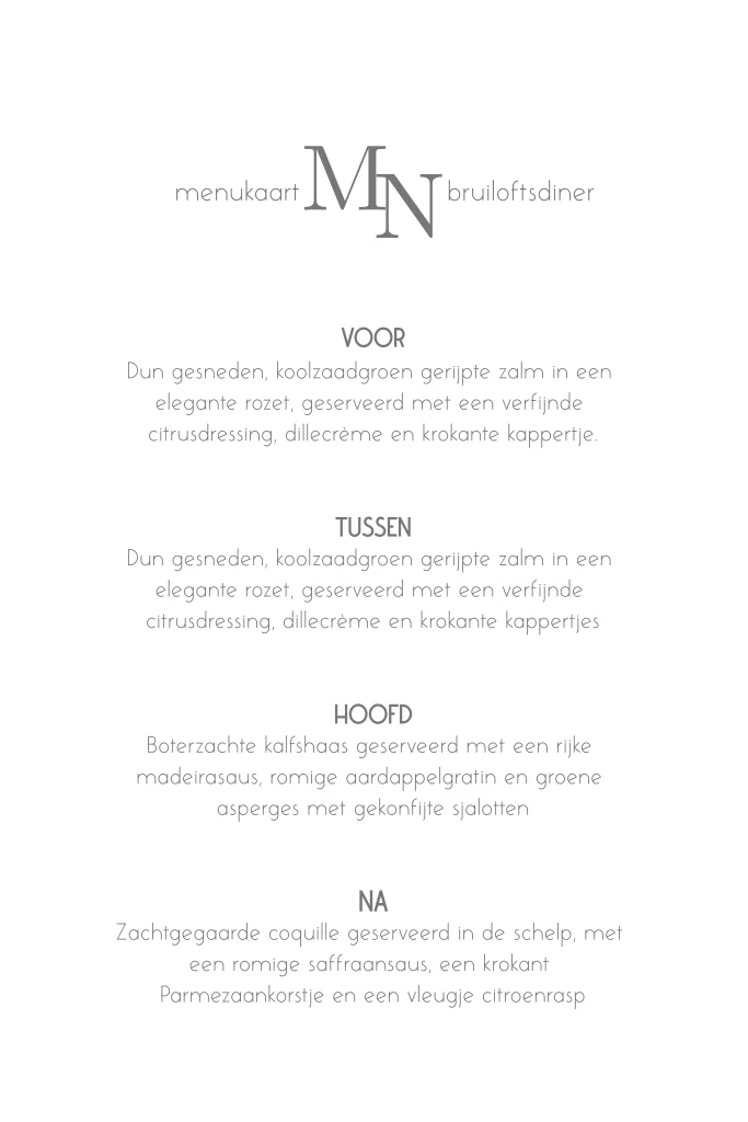 Strik om deze menumkaart een mooi lint dat past bij de stijl en sfeer van jullie bruiloftsdiner. Je kunt ook zonder lint deze menukaart bestellen.