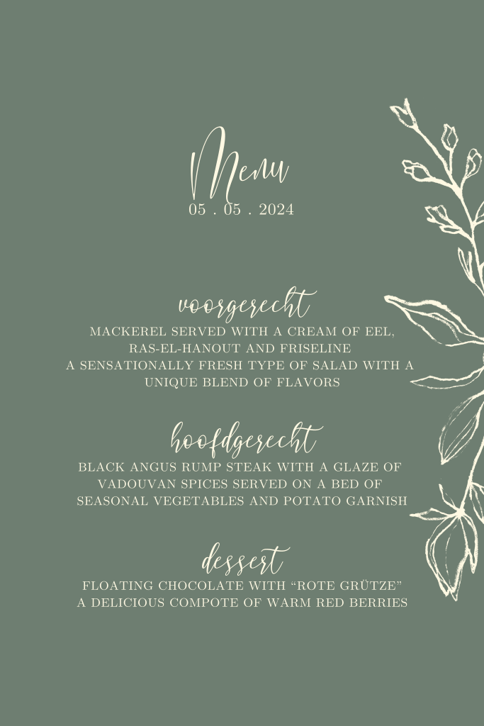 Op een wit gedekte diner tafel zal deze donker groene menukaart mooi opvallen. Elke andere achtergrondkleur kan in de kaartopmaker gekozen worden zodat hij past bij jullie bruiloftthemakleur.
