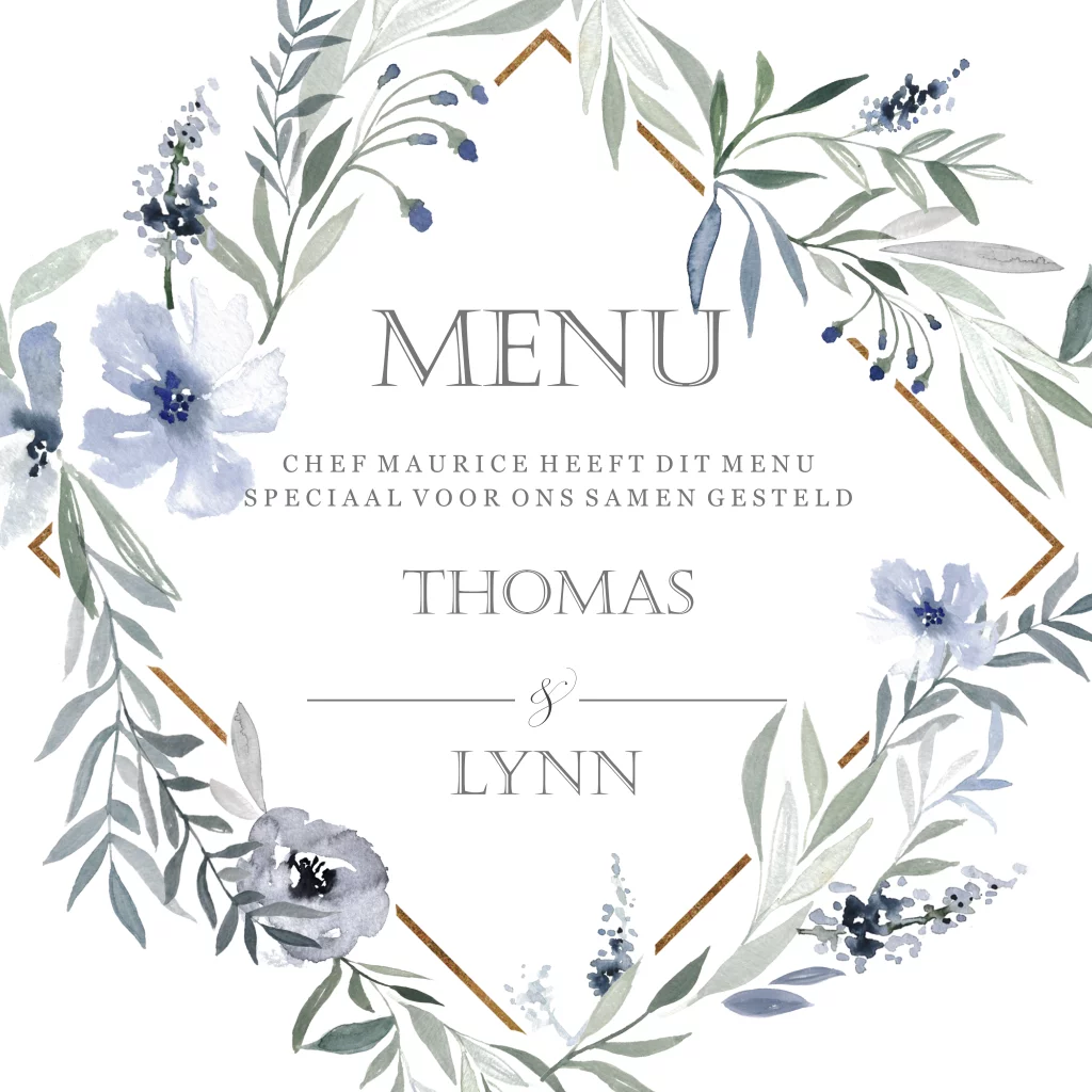 Prachtige menu kaart met een mooi kader. Het kader is helemaal versierd met blauwe watercolor bloemen.