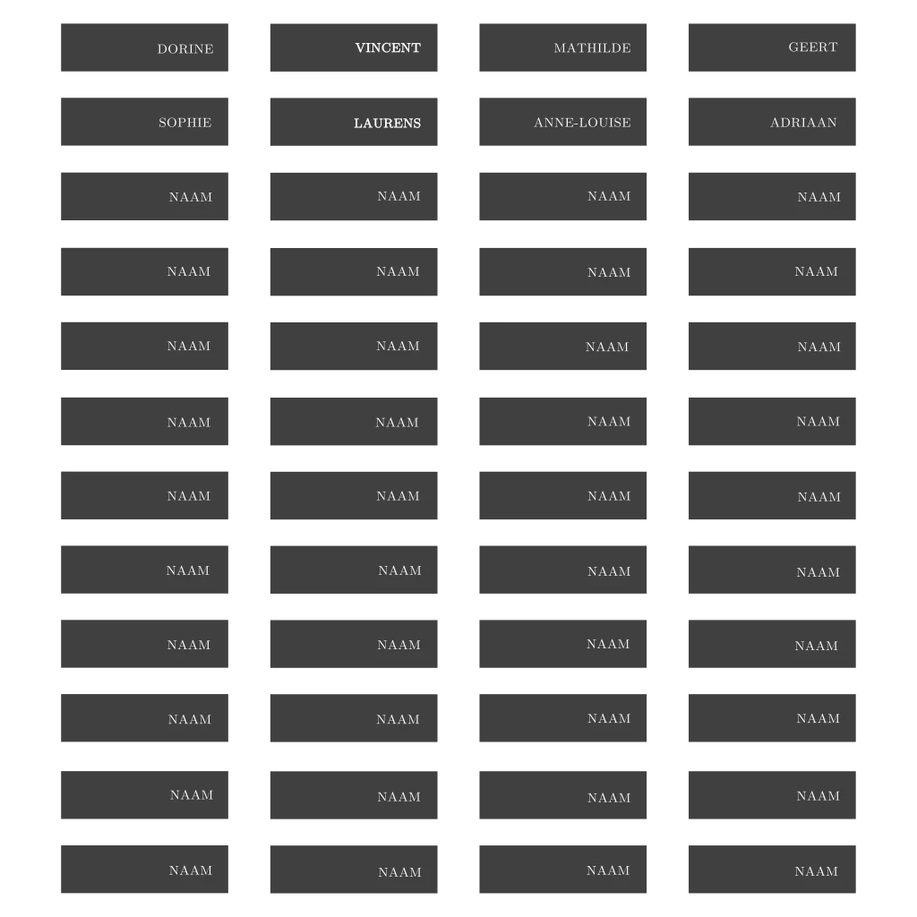 Vul in de kaartopmaker voor elke gast de naam in. Bestel de naamkaartjes met daarbij de lakzegels. Keuze uit verschillende kleuren. Je vindt ze bij de producten.