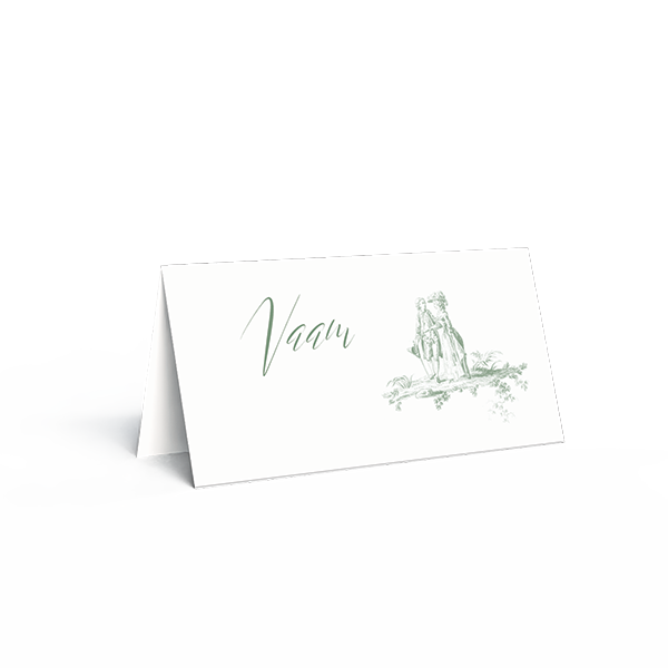 Ontwerp naamkaartjes bruiloft voor tijdens het diner op jullie grote dag. Dit zijn vintage naamkaartjes diner met Toile de Jouy in groene tinten. Je vouwt deze tafelkaartjes dubbel en zet ze bij elk bord.| Totaalprijs: 0 |